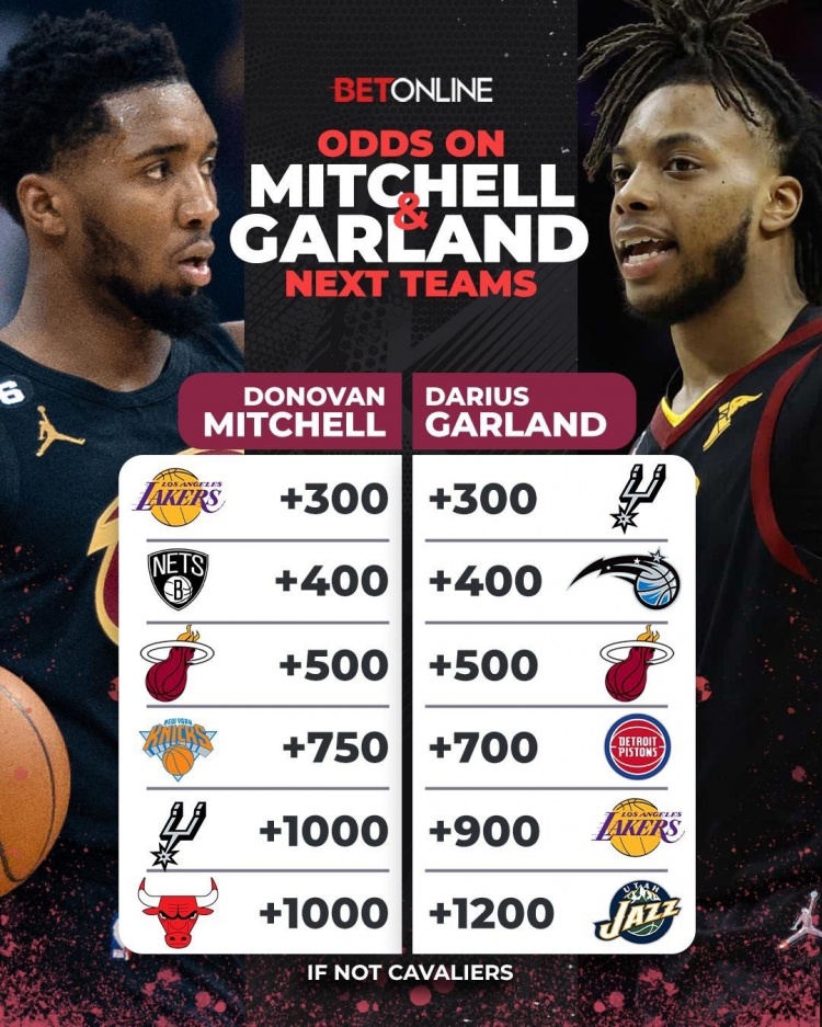 5月30日报道 今天,博彩网站更新了米切尔和加兰若离开骑士的情况下的下家赔率,具体为:米切尔:湖人+300篮网+400热火+500尼克斯+750马刺+1000公牛+1000加兰:马刺+300魔术+400热火+5