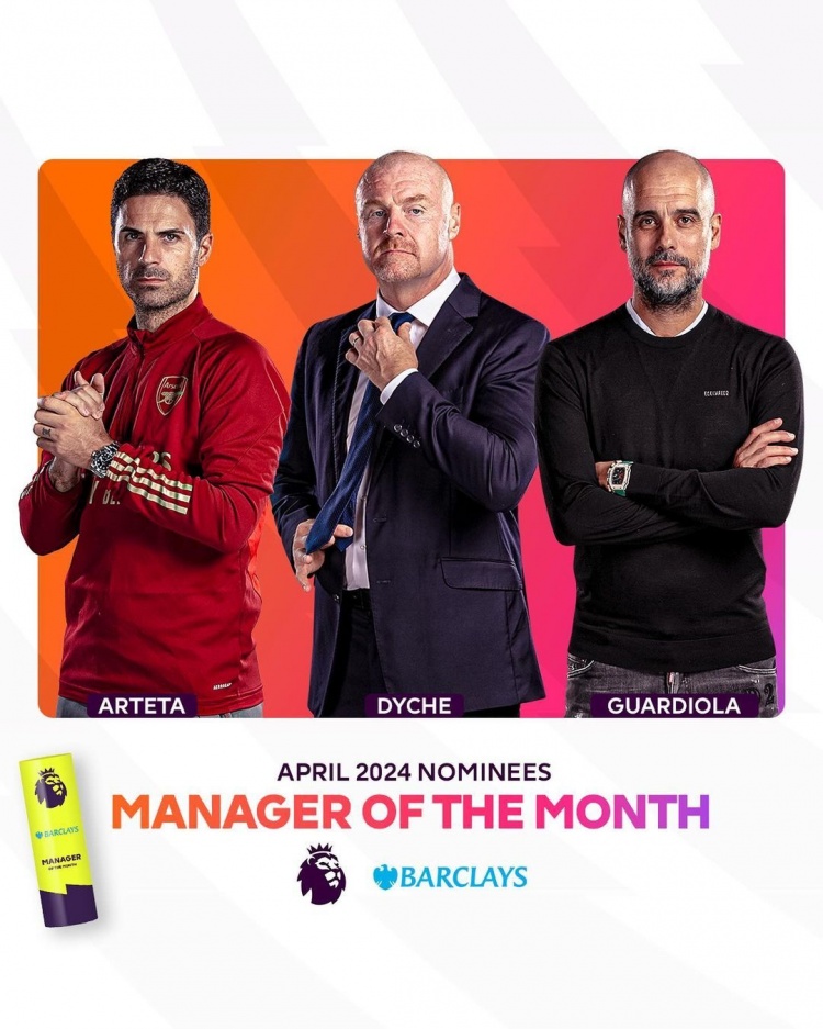 5月2日讯 今天,英超官方公布了4月最佳主教练的候选名单,阿尔特塔、瓜迪奥拉和戴奇获得提名。