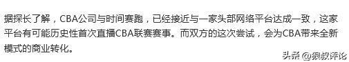 根据媒体人“球圈赵探长”发文:CBA公司与时间赛跑,已经接近与一家头部网络平台达成一致,这家平台有可能历史性首次直播CBA联赛赛事。 具体原文如下:这几天大家都在讨论CBA新赛
