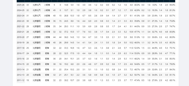 翟晓川出自北京男篮青训体系,11-12赛季,他首次代表北京一线队征战CBA,截至25-26赛季,已效力球队15个赛季,期间三次跟队获得联赛冠军。15个赛季中,翟晓川的巅峰赛季是在16-17赛季,常规赛场均可砍下17分6.4篮板。