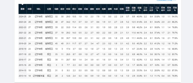 赵继伟出自辽篮青训体系,13-14赛季,他首次代表辽篮征战CBA,截至25-26赛季,已效力球队12个赛季,期间四获联赛冠军。12个赛季中,赵继伟的巅峰赛季是在23-24赛季,常规赛场均数据15.1分8.6助攻,得分串联一手抓。