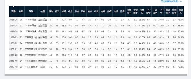胡明轩是杜锋一手栽培起来的球员,17-18赛季首次代表广东男篮征战CBA,截至25-26赛季,已效力球队9个赛季,期间跟队3获联赛冠军。23-24赛季暂时是他的巅峰赛季,常规赛场均可为球队贡献16.5分3.5助攻3.6篮板。