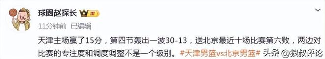 天津主场赢了15分,第四节轰出一波30-13,送北京最近十场比赛第六败,两边对比赛的专注度和调度调整不是一个级别。