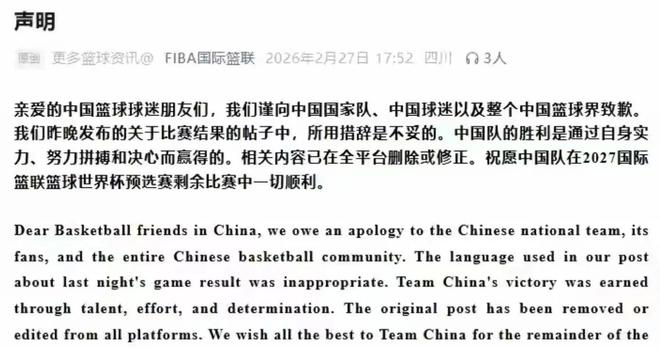 可这份道歉里,从头到尾没有一句提及裁判的问题,没有一句反思吹罚的不公,甚至连一句对中国男篮的真切歉意都没有。