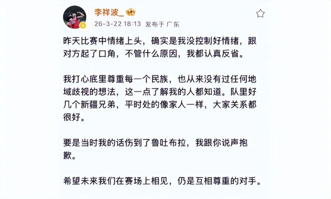 在意识到事情的严重性后,李祥波也是在网上发声进行了公开道歉:“我打心底里尊重每一个民族,也从来没有过任何地域歧视的想法。”“要是当时我的话伤到了鲁吐布拉,我跟你说声抱歉”。