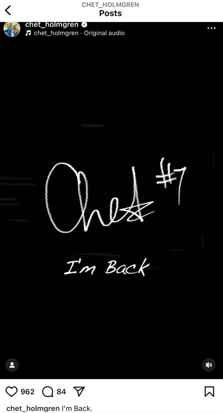 雷霆目前40胜9负,在本赛季常规赛剩下的时间里,霍姆格伦将重新融入这个年轻的、正在崛起的冠军争夺者。