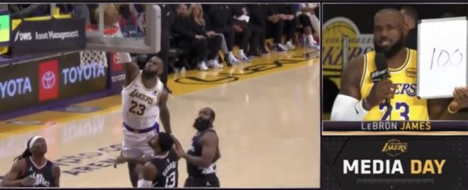 詹姆斯虽然从未参加扣篮大赛,但他无疑也是NBA顶级扣将,生涯有太多精彩隔扣。如今詹姆斯在新赛季媒体日接受Spectrum SportsNet采访,他给自己2019-20赛季隔扣别利察打10分,2021-22赛季隔扣好友乐福打9分,而2023-24赛季隔扣乔治打100分(夸张说法)。