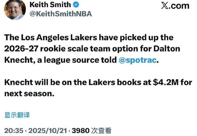 - 北京时间10月21日,根据NBA记者Keith Smith报道,湖人已经执行24岁年轻球员克内克特的2026-27赛季价值420万美元...发表于: 10-21 23:39