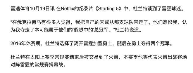 再者说了,杜兰特在上个赛季常规赛结束之后被直接交易到火箭队,他也没有任何的怨言。说白了。在NBA打球根本不存在着一人一城的说法,因为这个联盟赛事存在着很多商业操作,很多球员今天还在一个球队打比赛,明天醒来可能就被交易到另外一个球队。所以不管对于杜兰特还是对于任何NBA球星来说,在这个球队的时候就好好打球,去到下一个球队同样也会全力以赴,这才是职业精神,这才对得起每一个球队对他进行了巨额投资。
