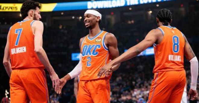 雷霆队这边,亚历山大22中14,空砍33分3篮板8助攻,已经连续101场得分上20+,继续刷新NBA历史第二长纪录;杰威得到17分6篮板8助攻;切特-霍姆格伦仅得7分3篮板。