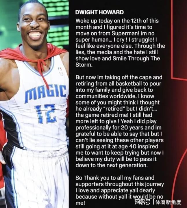 这一天,终究还是来临了。“魔兽”霍华德通过发布一篇长文,郑重宣布告别那身象征着荣耀与拼搏的超人战袍,正式为自己的球员生涯画上句号。值得一提的是,早在去年,这位传奇人物就已