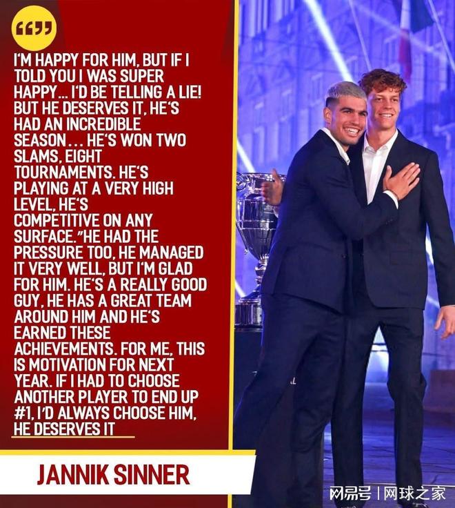 “我为他感到高兴,但如果我欣喜若狂,那就太假了!不过他实至名归,他度过了一个不可思议的赛季,他夺得两个大满贯冠军,八项锦标赛冠军。他太强大了,在任何场地都极具威胁。即使他有很大压力,但他处理得很好,我为他感到高兴。”辛纳坦言,虽然年终世界第一被阿尔卡拉斯抢走了,但是自己心里一点都不失落,反而替西班牙人感到高兴,因为阿尔卡拉斯在本赛季的出色表现,获得这项荣誉实至名归。