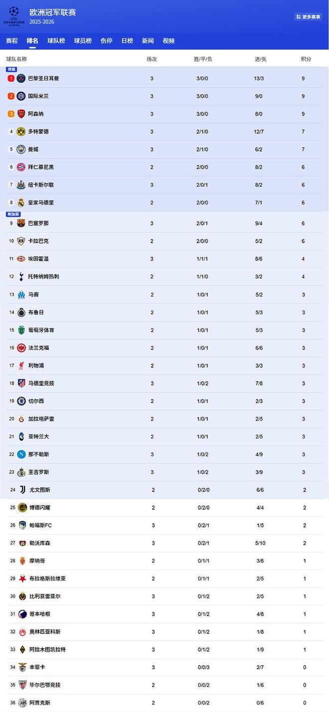 在这场进球大战中,巴黎圣日耳曼7-2获胜,3轮欧冠狂轰13球,凭借净胜球的优势,力压同为3连胜的国际米兰和阿森纳排在积分榜榜首。