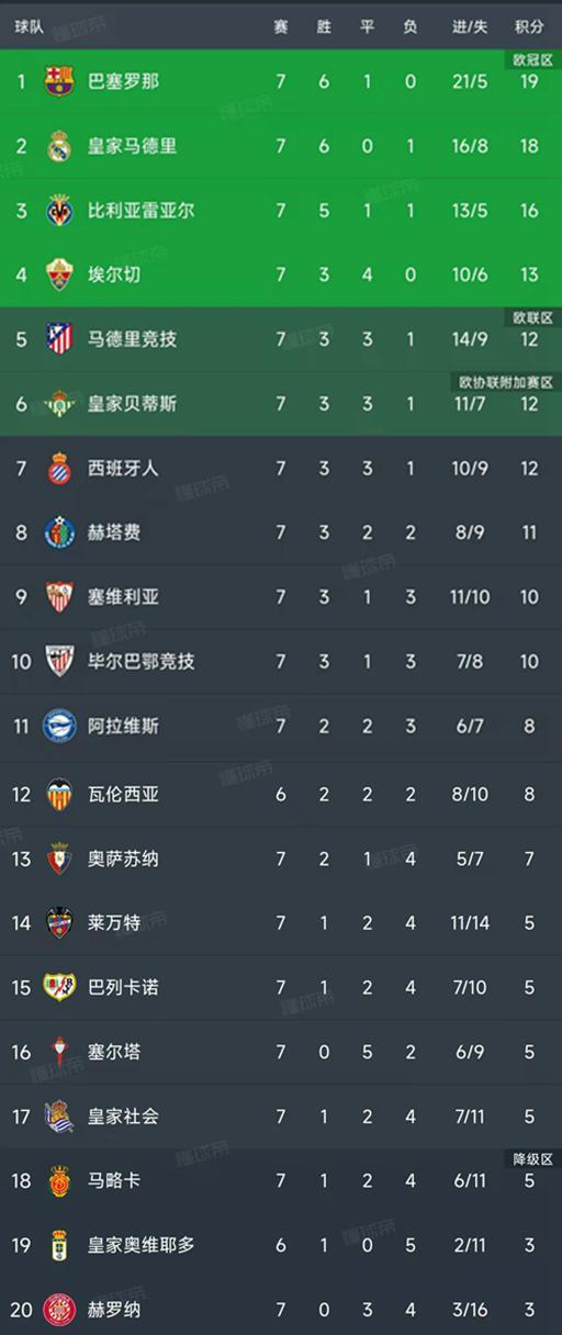 北京时间9月29日,西甲第7轮又结束了两场对决,我们一起看看最新积分榜变动,主要的信息如下:巴萨2-1战胜皇家社会,继续保持不败金身,以19分反超18分的皇马登顶榜首,皇家贝蒂斯主场2-0战胜奥萨苏纳暂列第6名。