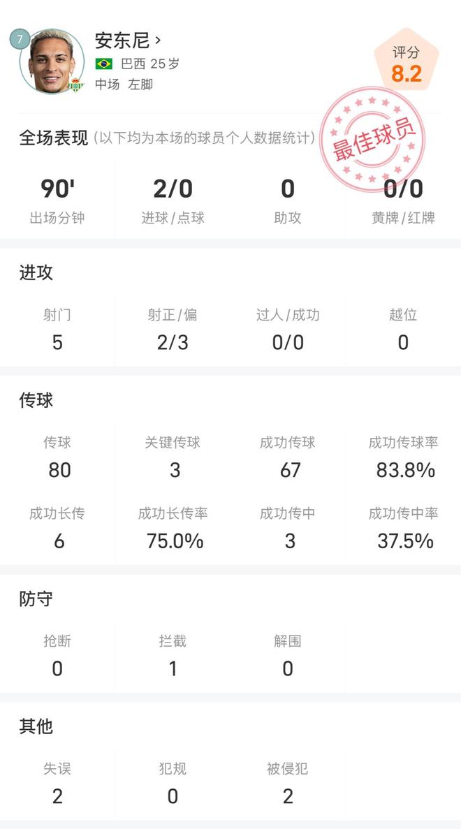 雷速体育10月19日宣 在刚刚结束的西甲联赛第9轮,凭借着安东尼的双响+绝平,皇家贝蒂斯客场2-2战平比利亚雷亚尔。此役安东尼首发并踢满全场90分钟,5次射门2次射正,在预期进球数