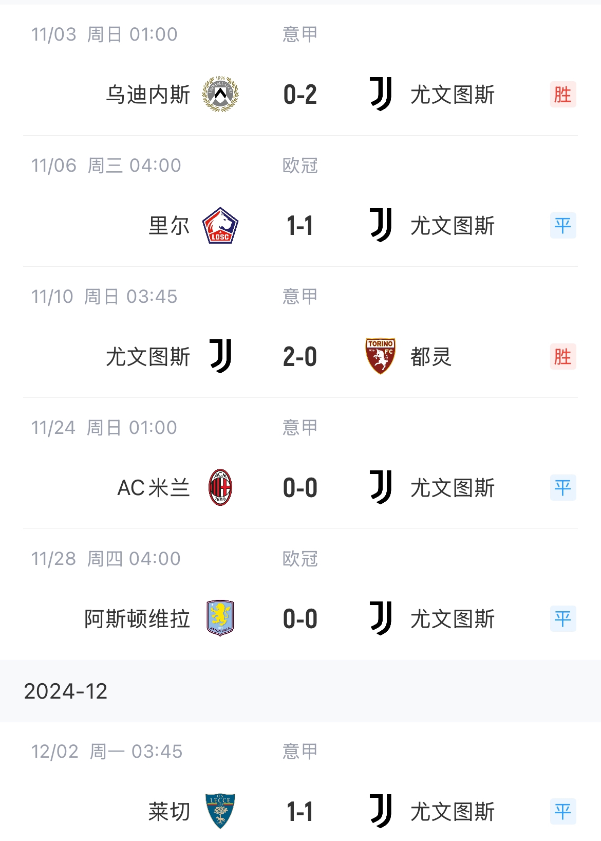 12月02日报道 意甲第14轮,尤文补时遭绝平1-1莱切。尤文各赛事三连平,联赛不败但14场已有8场平局。欧冠中,尤文前五轮2胜2平1负。