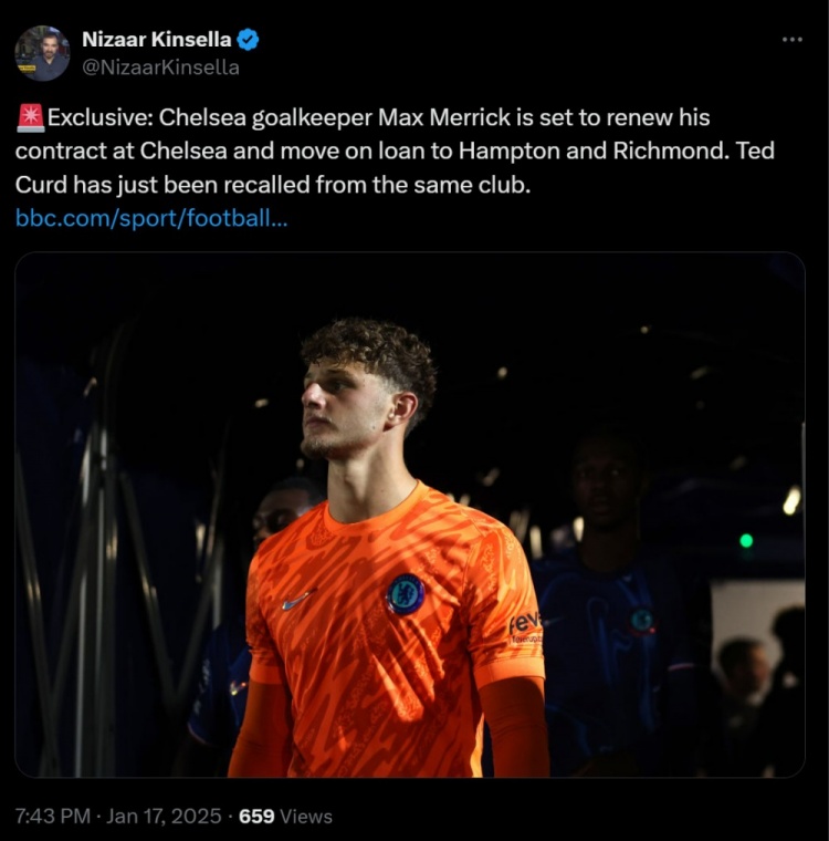 记者:切尔西19岁门将梅里克将续约,然后外租至第六级别球队效力