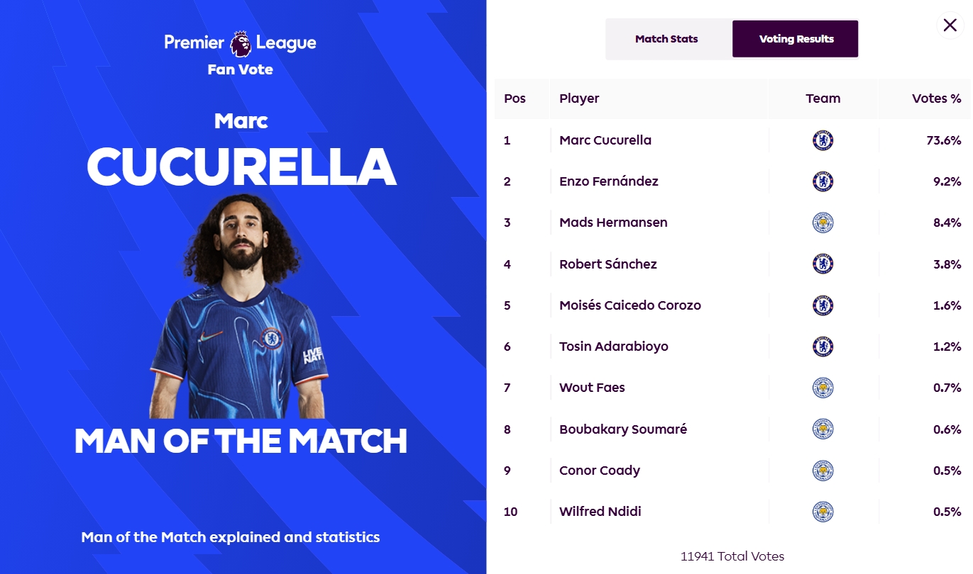 3月10日报道 英超第28轮,切尔西1-0莱斯特城。库库雷利亚首发出战,赛后以73.6%得票率当选全场最佳。