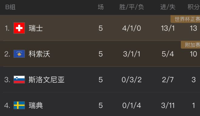 在北京时间11月16日结束的世界杯欧洲区预选赛B组一场焦点战中,世界排名第40位的瑞典再次迎来溃败,他们在客场1-4完败给世界排名第17位的瑞士队,遭遇4连败后5轮仍不胜仅积1分,耻辱垫底。
