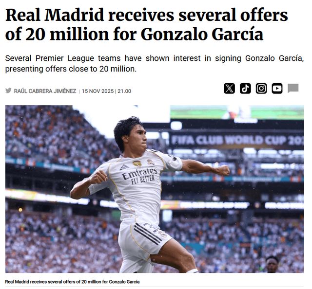世俱杯成名的贡萨洛-加西亚很有天赋,但在皇马,贡萨洛-加西亚与姆巴佩、维尼修斯竞争,想要出头难度极大。桑德兰当地的《回声报》消息称,至少3家英超俱乐部有意引进贡萨洛-加西亚,“黑猫”是其中之一。