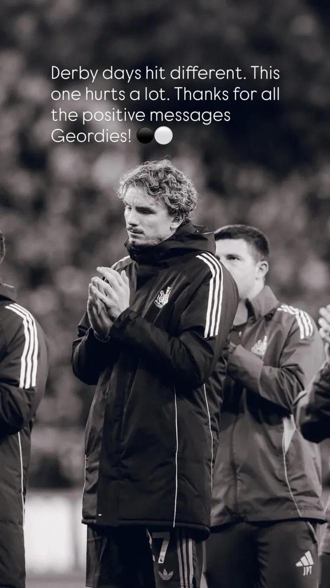 沃尔特马德晒出图片并写道:“德比总是别样滋味,这一场尤其令人心痛。感谢所有支持我的纽卡斯尔球迷发来的鼓励信息。”