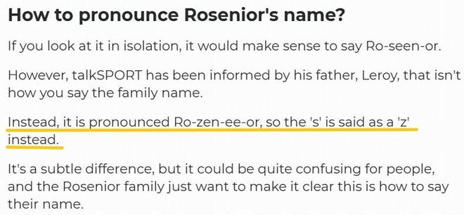 那么,以尊重球员本人的发音对其名字进行翻译的原则,Rosenior就应该被译为罗曾尼尔。