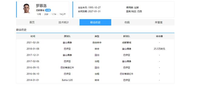 来自成都蓉城俱乐部,巴西籍,司职中场,1995年球员,现今29岁,年龄较合适