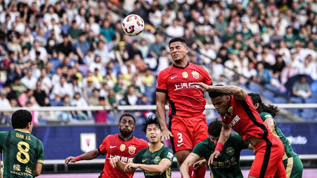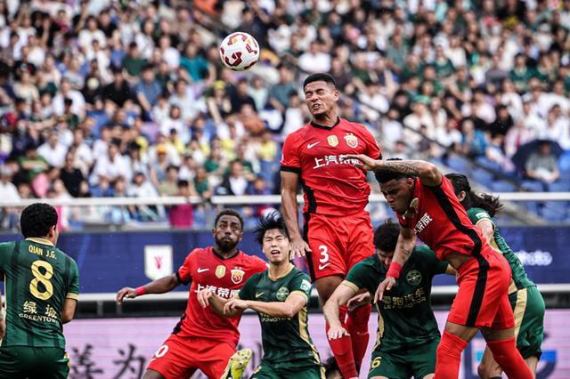 6月14日,上海海港队球员蒋光太(上)在比赛中头球攻门。 当日,在浙江杭州举行的2025赛季中国足球超级联赛第14轮比赛中,浙江俱乐部绿城队主场2比2战平上海海港队。 新华社记者 江汉 摄