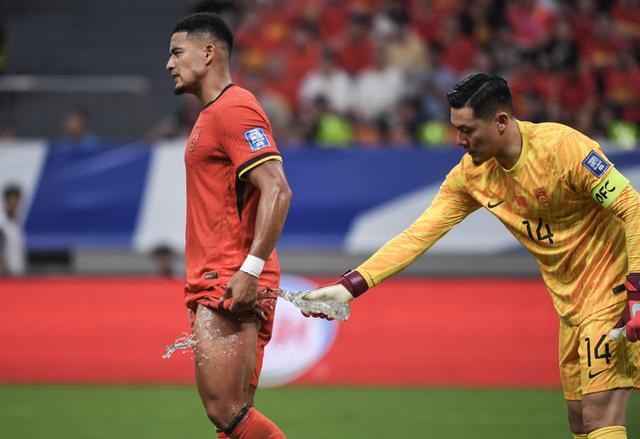 2025年6月10日,中国队守门员王大雷(右)和队友蒋光太在比赛间隙。 当日,在重庆举行的2026年美加墨世界杯亚洲区预选赛18强赛C组第十轮比赛中,中国队主场1比0战胜巴林队。 新华社记者 陈诚 摄