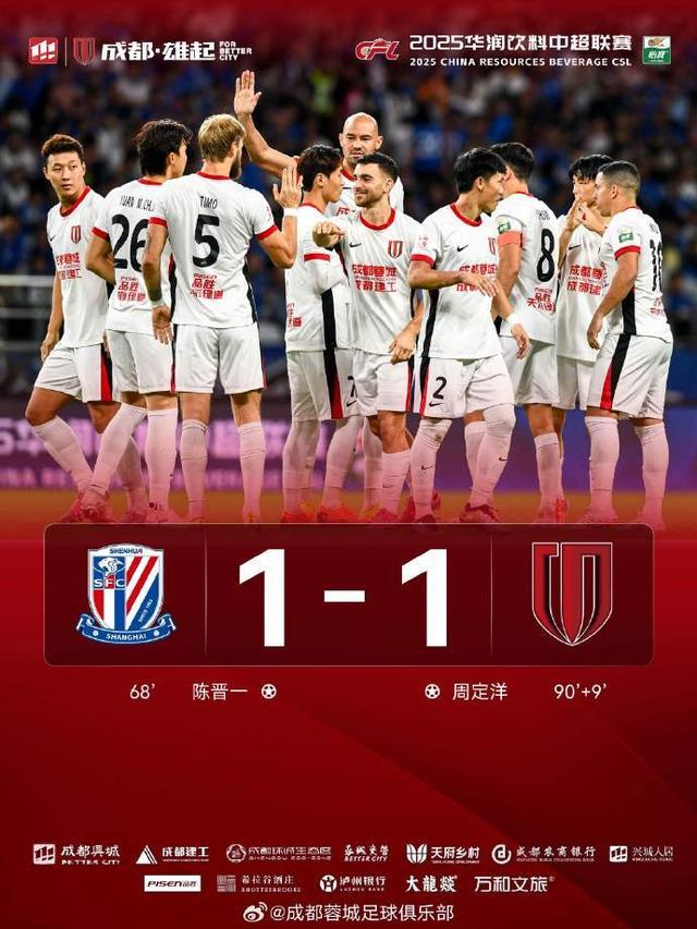 比分来到补时第九分钟,也是全场比赛理论上的最后一分钟,始终得势不得分的成都蓉城队迎来金子般的进球。当时,蓉城队发动冲吊,皮球在申花禁区内形成射门后来回折射,后插上的蓉城队后腰周定洋捡漏得分,在最后时刻把比分扳平。这场平局,也让成都蓉城继续成为中超积分榜领头羊,但上海申花未能缩小3分的积分差距,如今依旧距离蓉城、海港还有3分。