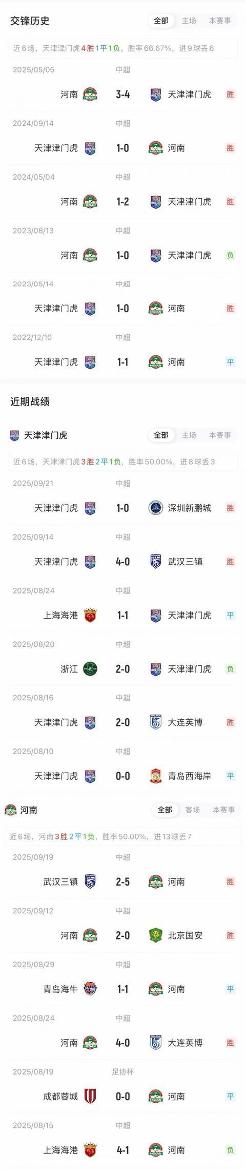 两队近期中超均取得两连胜,津门虎积分40分排在积分榜第6;河南29分排第11。近3次交手,津门虎均击败河南。