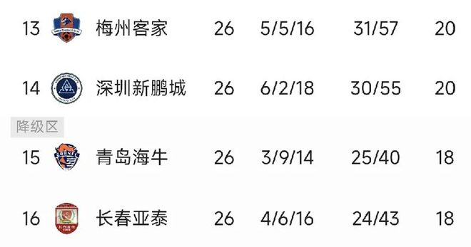 相比中超争冠球队,其实保级军团压力更大。冠军只有一个,今年争不上,重整旗鼓,明年继续争。保级则不然,降级队有两支,而且一旦降入中甲,不一定何年何月再杀回来了!中超26轮战罢,最悬的是同积18分的青岛海牛和长春亚泰,其次是同积20分的深圳新鹏城和梅州客家。