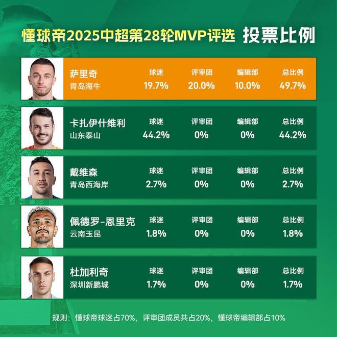 大家好,欢迎来到懂球帝2025赛季中超MVP评选现场。中超第28轮MVP得主出炉,青岛海牛队35岁老将、队长萨里奇凭借在工体的3球1助攻,以5.5%的优势反超山东泰山队的前锋卡扎伊什维利